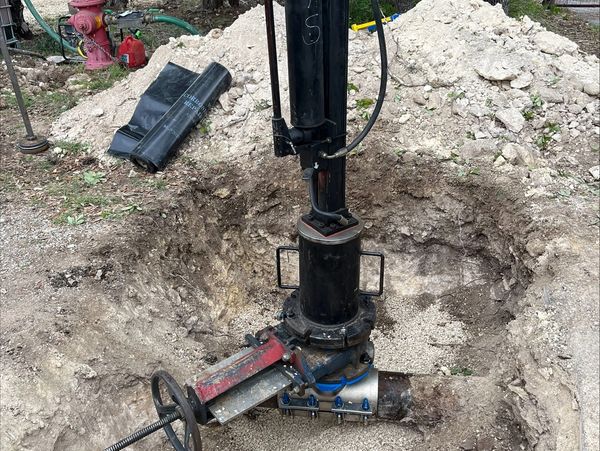 First, a sleeve is mounted to the main with a temporary valve mounted on top. A machine is prepped to cut the hole and another is prepped for the line stop.